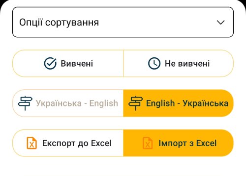Маючи необхідний мінімум слів/фраз у словнику, ви можете почати з їх вивчення на сторінці Навчання. За замовчуванням переклади доданих слів/фраз є невидимими та закриті сірим кольором. Для вивченя ви можете торканням пальця відкривати переклади один за одним або зробити їх видимими всі й одразу, торкнувшись відповідної іконки: