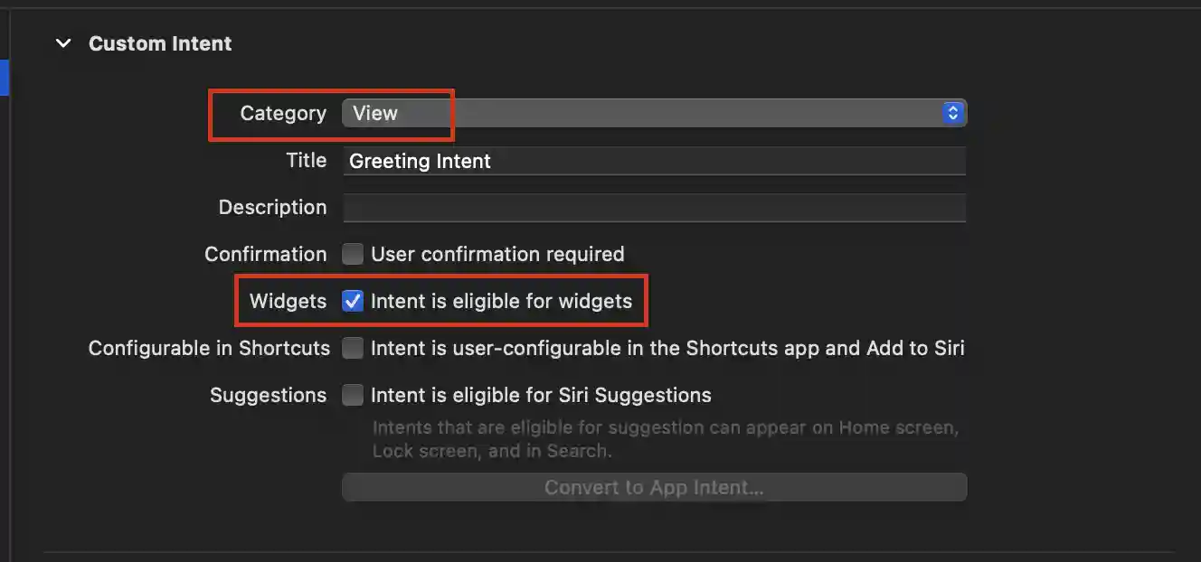 WidgetConfigurationIntentdefined that will determine the configuration options of the Widget inAppIntent.swift.Adjusting the Configuration Intent