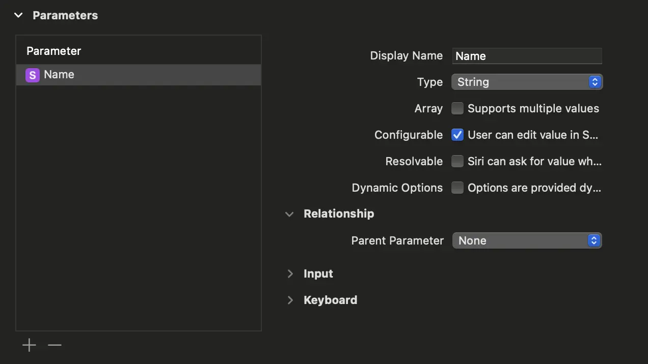 IntentHandlerto handle the new Intentimport Intents class IntentHandler: INExtension, GreetingIntentIntentHandling { func providePunctuationOptionsCollection(for intent: GreetingIntentIntent) async throws -> INObjectCollection<Punctuation> { let userDefaults = UserDefaults(suiteName: "YOUR_APP_GROUP") do { let jsonPunctuations = (userDefaults?.string(forKey: "punctuations") ?? "[\"!\"]").data(using: .utf8)! let stringArray = try JSONDecoder().decode([String].self, from: jsonPunctuations) let items = stringArray.map { punctuation in Punctuation(identifier: punctuation, display: punctuation) } return INObjectCollection(items: items) } catch { return INObjectCollection(items: [Punctuation(identifier: "!", display: "!")]) } } }Seeing Configuration in Flutter