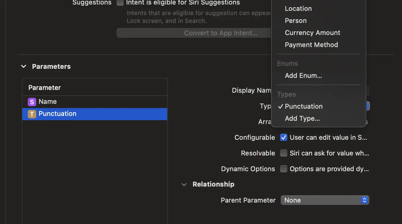 SimpleEntryto use properties instead of the Intent so we can use both the AppIntent and the SiriIntent.struct SimpleEntry: TimelineEntry { let date: Date let configuration: ConfigurationAppIntent let name: String var punctuation: String? = nil }Create an