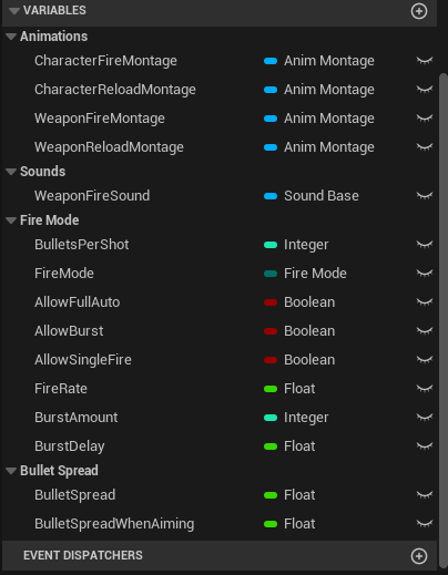 The FirearmData_BP is a child class of WeaponData_BP and is specifically designed for firearms. It stores critical data related to firearm behavior, animations, sounds, and fire mechanics.